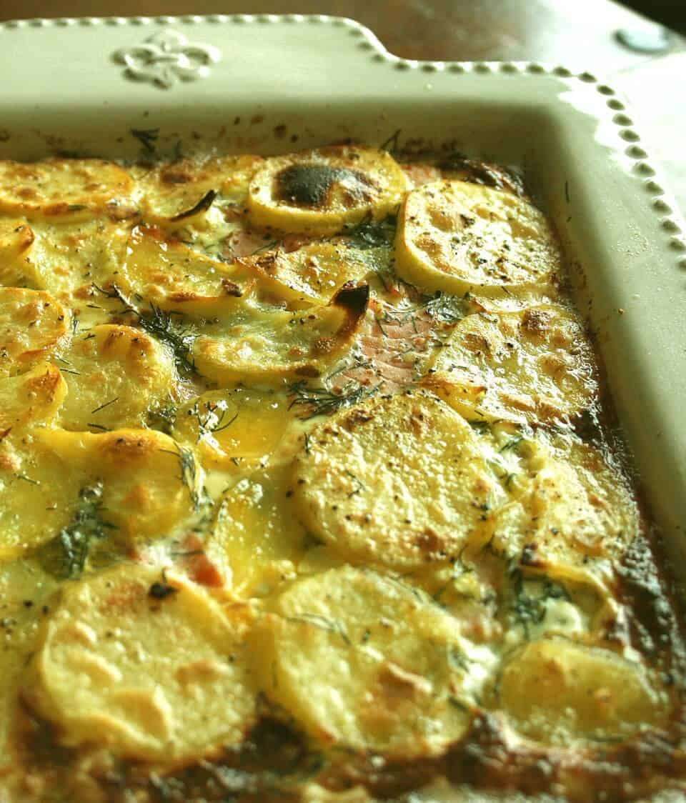- Layer the onions, salmon and potatoes into the baking dish starting with the potatoes, sprinkling each layer generously with the chopped dill and freshly ground white pepper from the mill. Finish the top with another layer of potato slices.