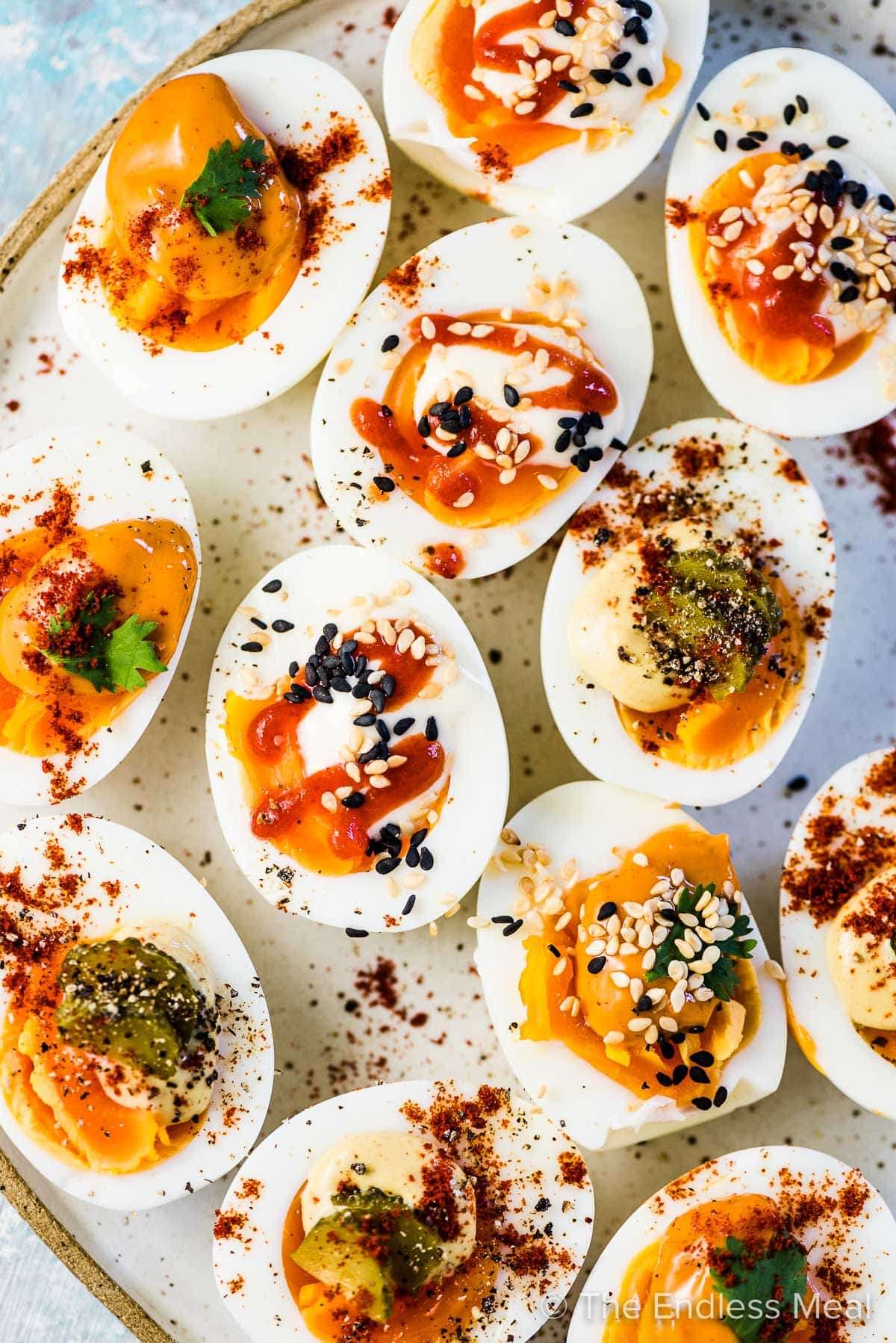 - When you're ready to snack, cut the eggs in half and top with the classic, chipotle, or spicy deviled egg toppings.