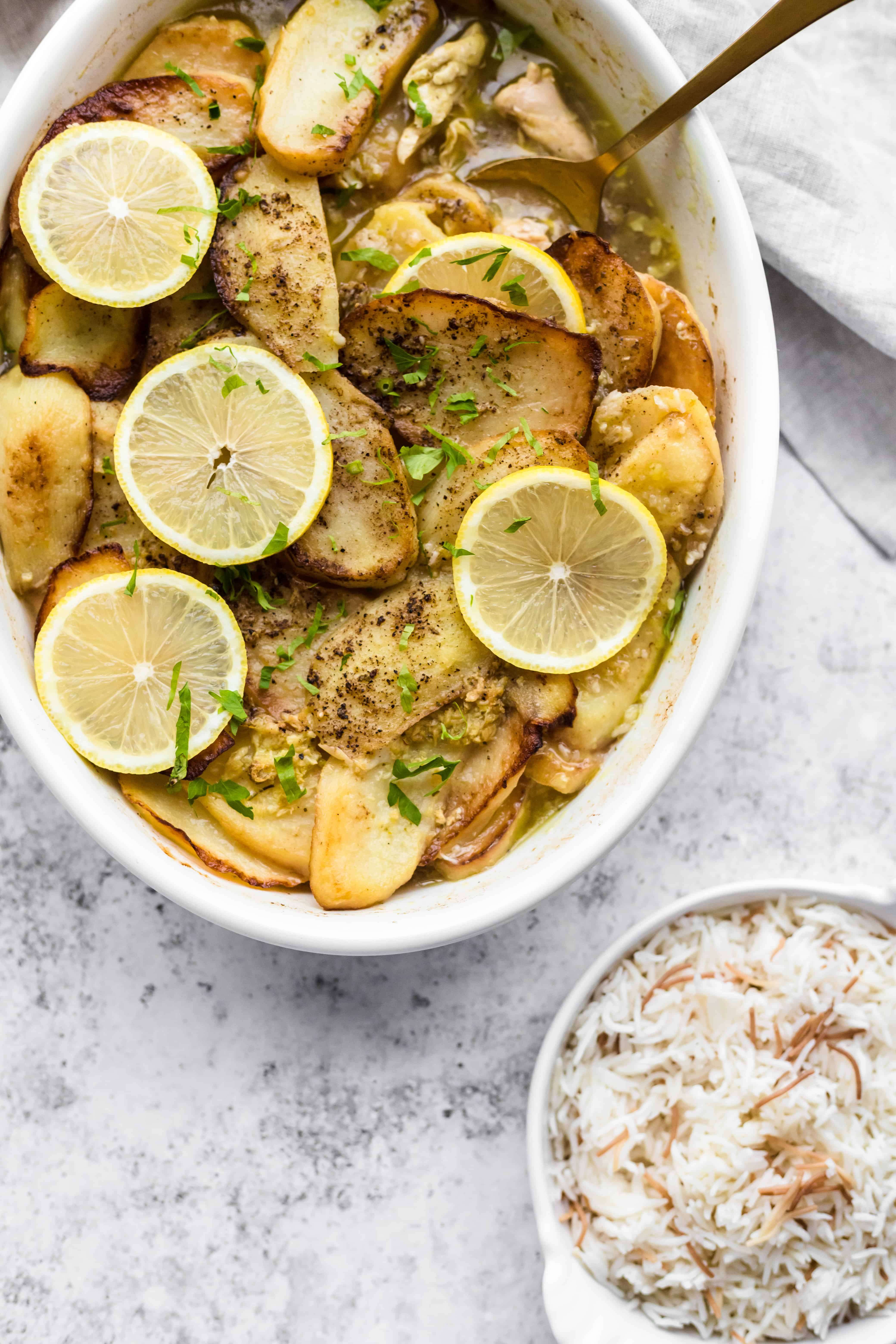 An easy 30 minute dish of chicken and potatoes in a lemony garlic olive oil sauce, that goes perfectly with vermicelli rice