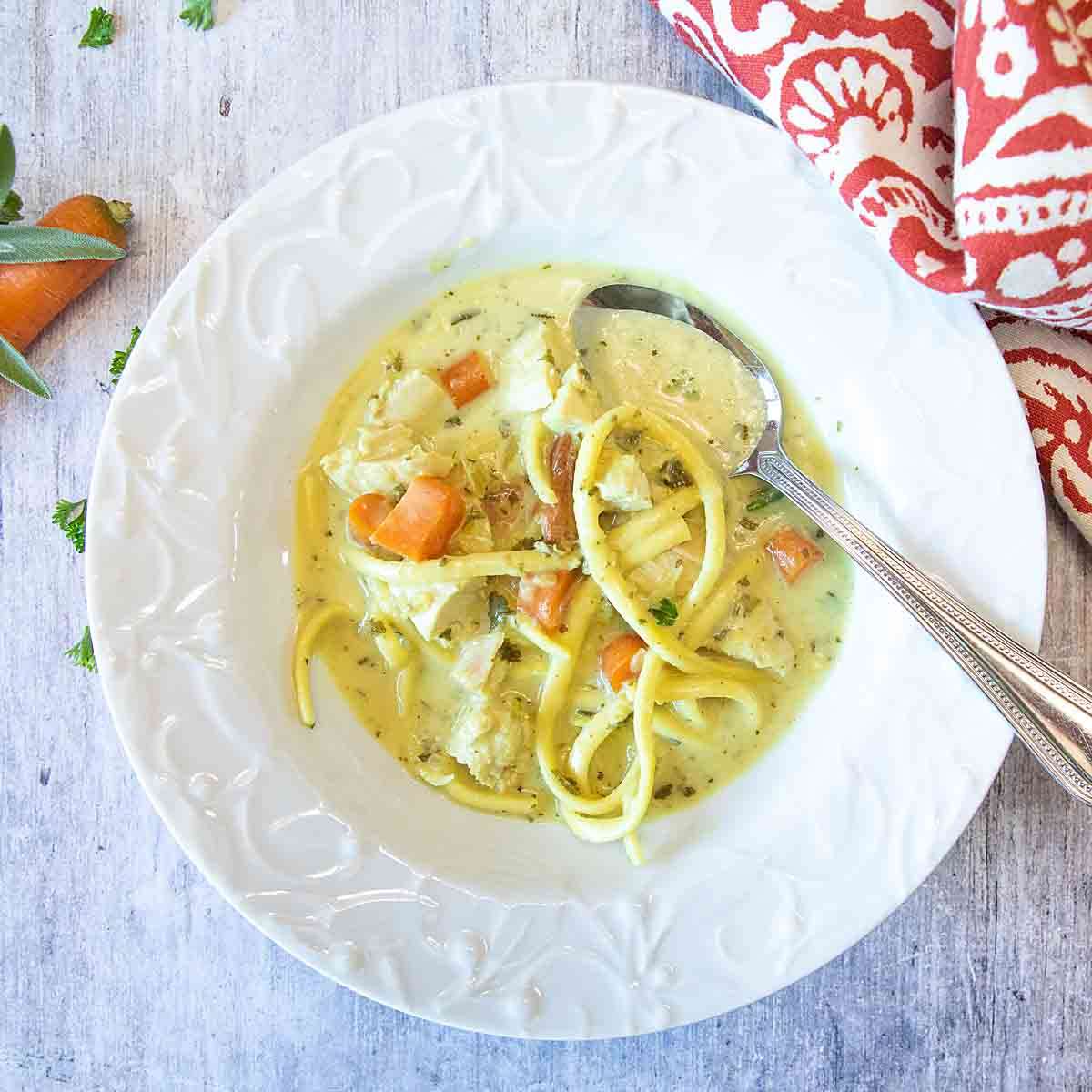 Slightly creamy and reminiscent of sage stuffing, Creamy LeftoverChicken Soup with Noodles and Sage is a tasty and easy recipe!