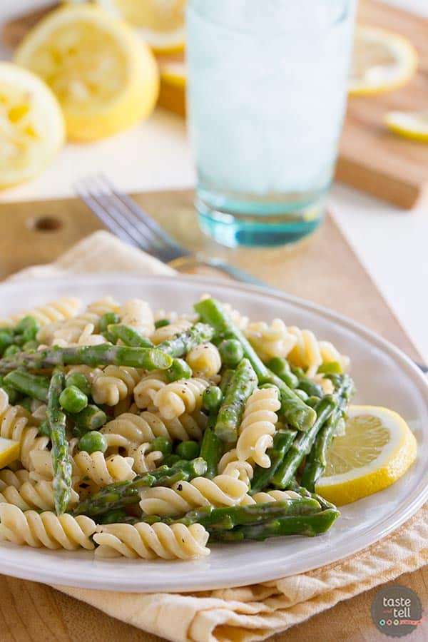 A light citrus flavor brightens this silky cream sauce in this Lemon Cream Sauce Pasta with Asparagus and Peas.