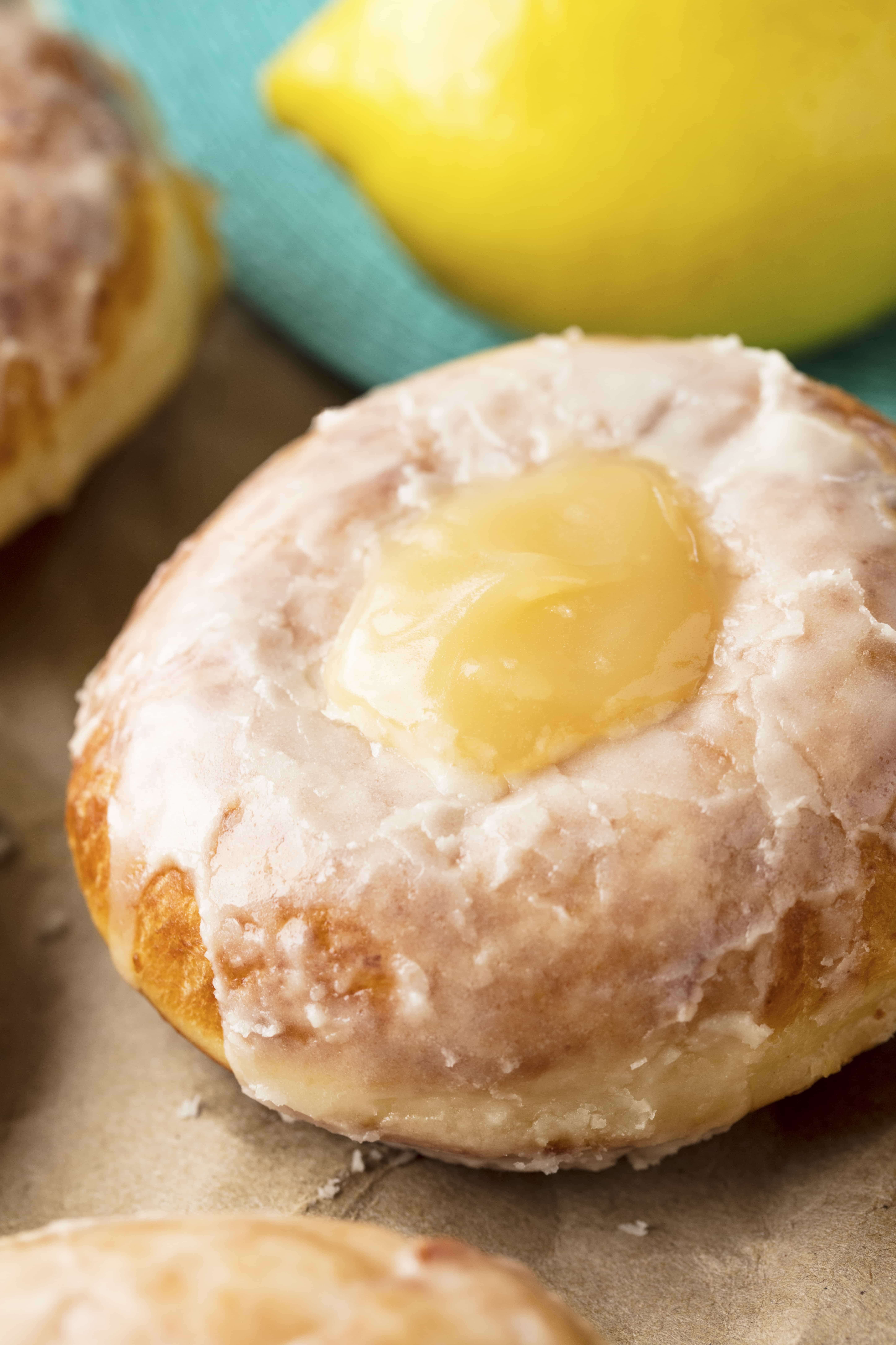 - Once all of the donuts have been fried, fill a piping bag with the lemon curd, like you would with frosting. Using a wide-mouth tip, insert the tip into the side of the doughnuts one at a time, squeezing to fill with 1 to 2 tablespoons of lemon curd per donut.