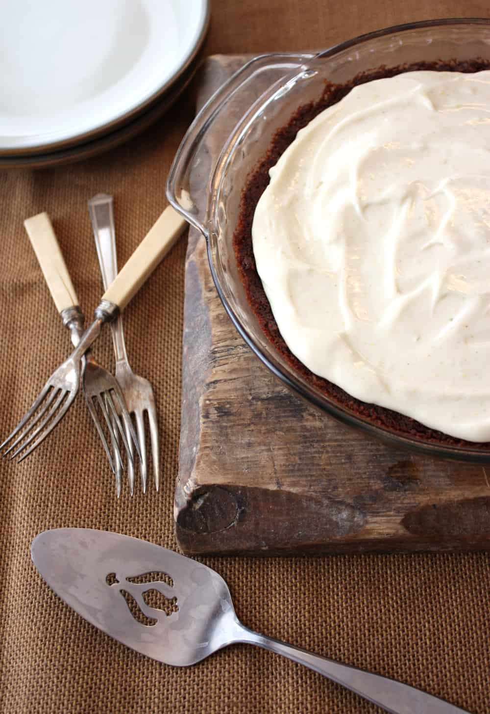An easy chocolate graham-cracker crust filled with a creamy dreamy lemon-lime filling. This is such a simple dessert to whip up for any festive occasion.