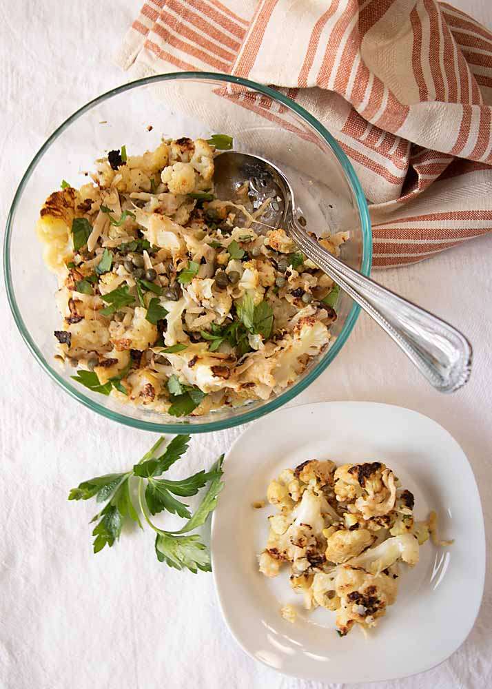 - While cauliflower is finishing, coarsely chop capers, then whisk in a small bowl with 2 Tablespoons oil and lemon juice.