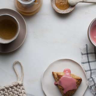 - In a medium bowl, prepare the glaze by mixing together the melted butter, powdered sugar, vanilla and lemon juice. Whisk until smooth. Dip the top of the scones into the glaze and allow the glaze to harden.
