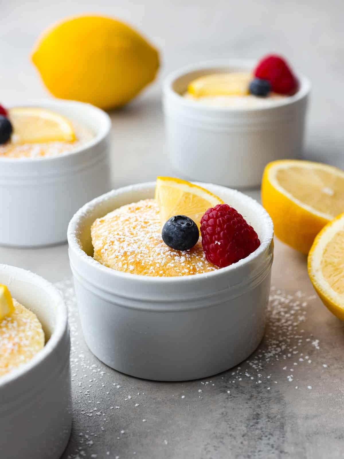 This lemon pudding cake is gorgeous, decadent, and delicious! Dusted with powdered sugar and topped with fresh berries, it's perfect for impressing your guests on any occasion!