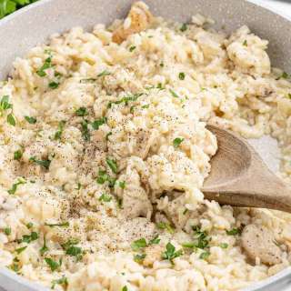- Reduce the heat and add the chicken stock, one ladle at a time, stirring to incorporate until the rice is creamy and cooked to your preference.