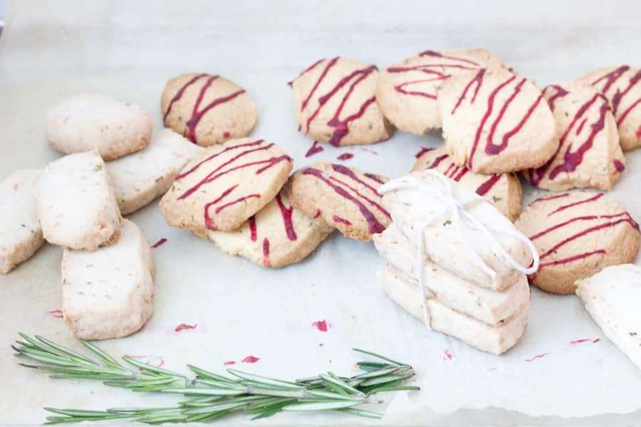 These lemon rosemary shortbread cookies are just as delicious and texturally-pleasing when made vegan or gluten-free as their all butter, white-flour counterparts. Drizzled with a bit of cranberry coulis, they're officially the best holiday cookies ever.