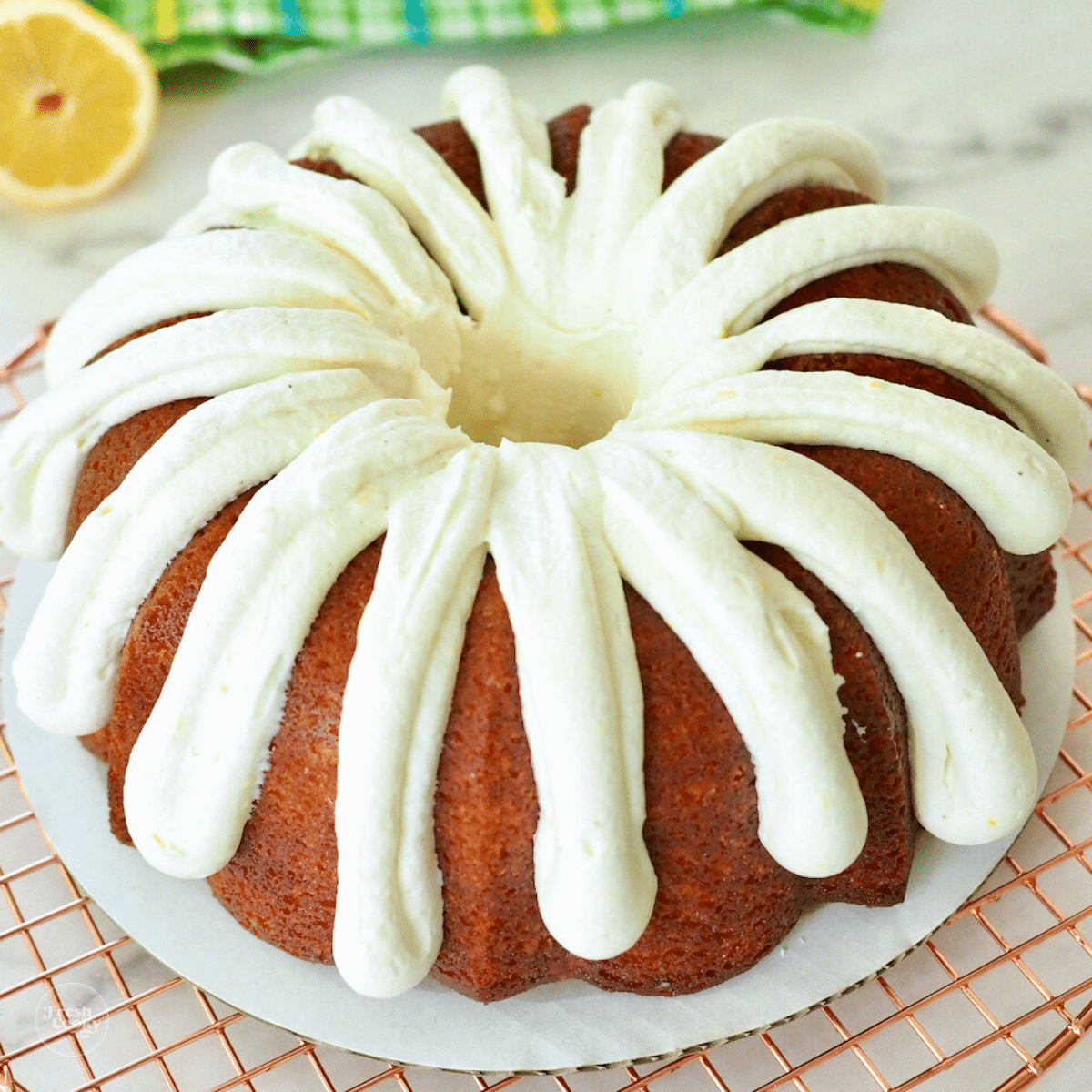 - Once cake is cooled, spoon frosting into piping bag fit with a large round tip and starting from the inside of the bundt cake, pipe a large finger to the outside and then back in if thick fingers of frosting desired. Smooth inside of bundt cake using off set spatula. Serve alone, with whipped cream or make it crazy and serve with vanilla ice cream or lemon ice cream.