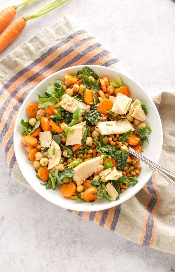 This Lentil Salad with Tuna packs a protein punch that will keep you full until dinner! It's full of Spring goodies like carrots and kale. Dress it with a simple lemon and olive oil dressing and you are good to go. {gluten free}