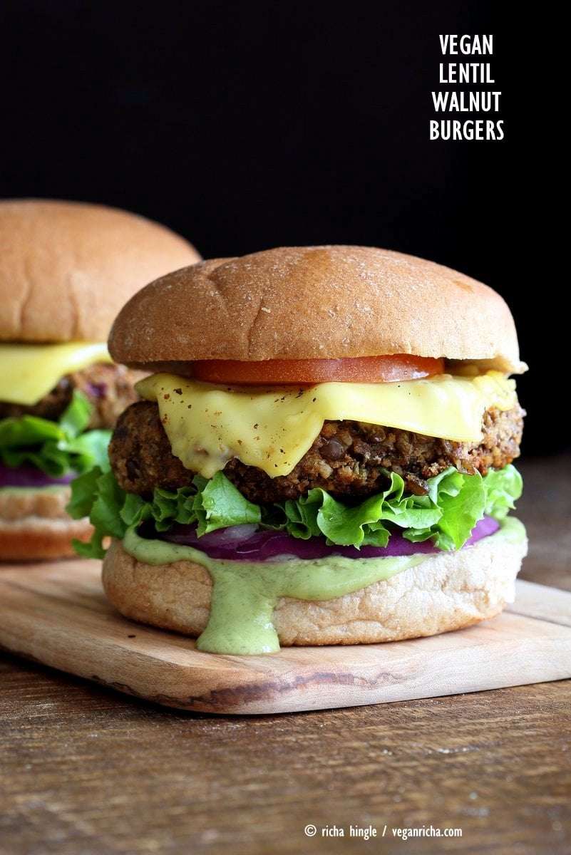 Spiced Lentil Walnut Burgers. Flavorful Burger patties with avocado ranch. Vegan Burger Recipe. Soyfree Easily gluten-free. Makes 4 to 5 large patties. Use gluten-free breadcrumbs or flour to make gf and serve the patties with dressing over a salad.
