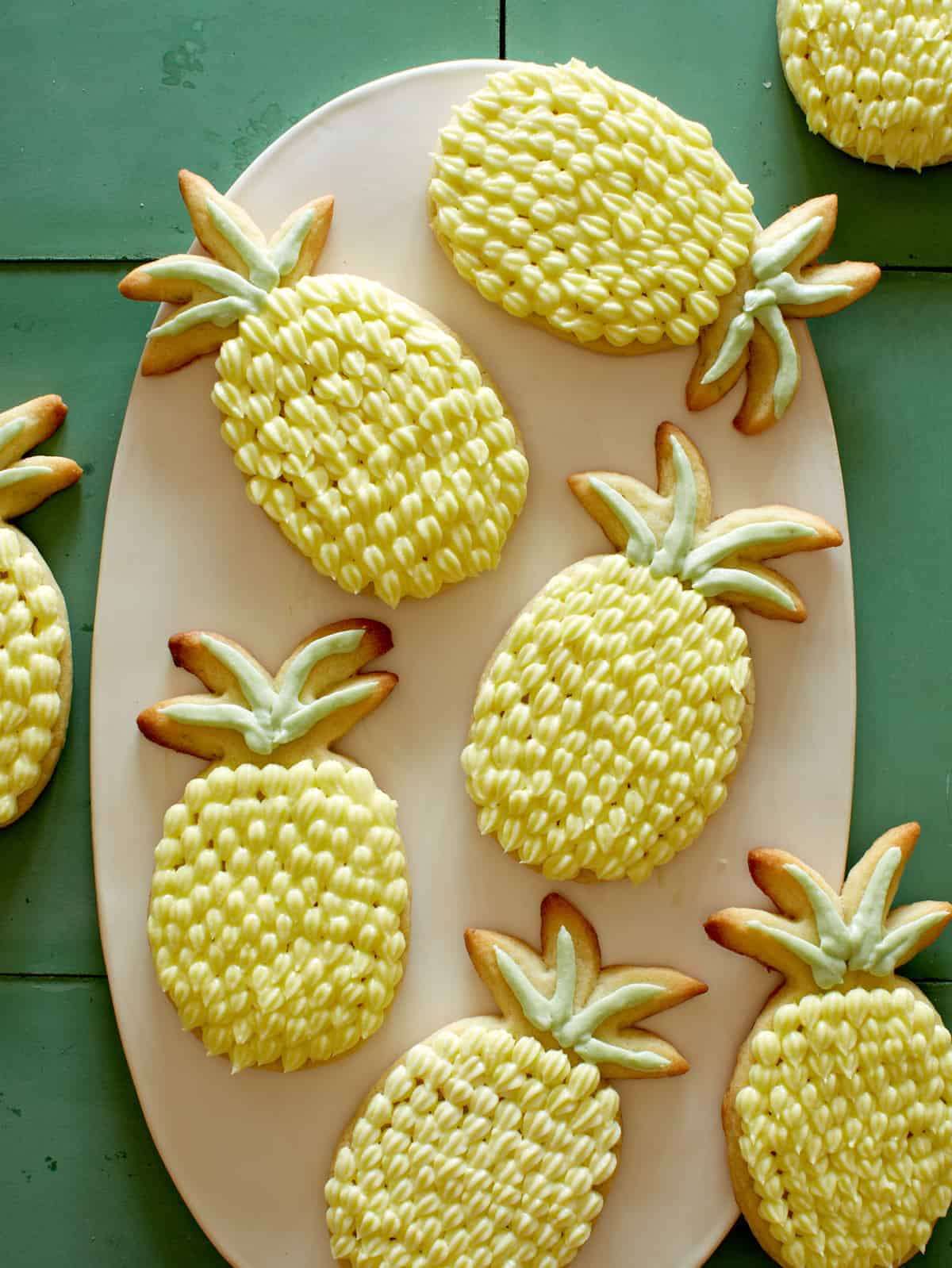 - Pipe the green buttercream over the leafy tops of the pineapple cookies to finish decorating.