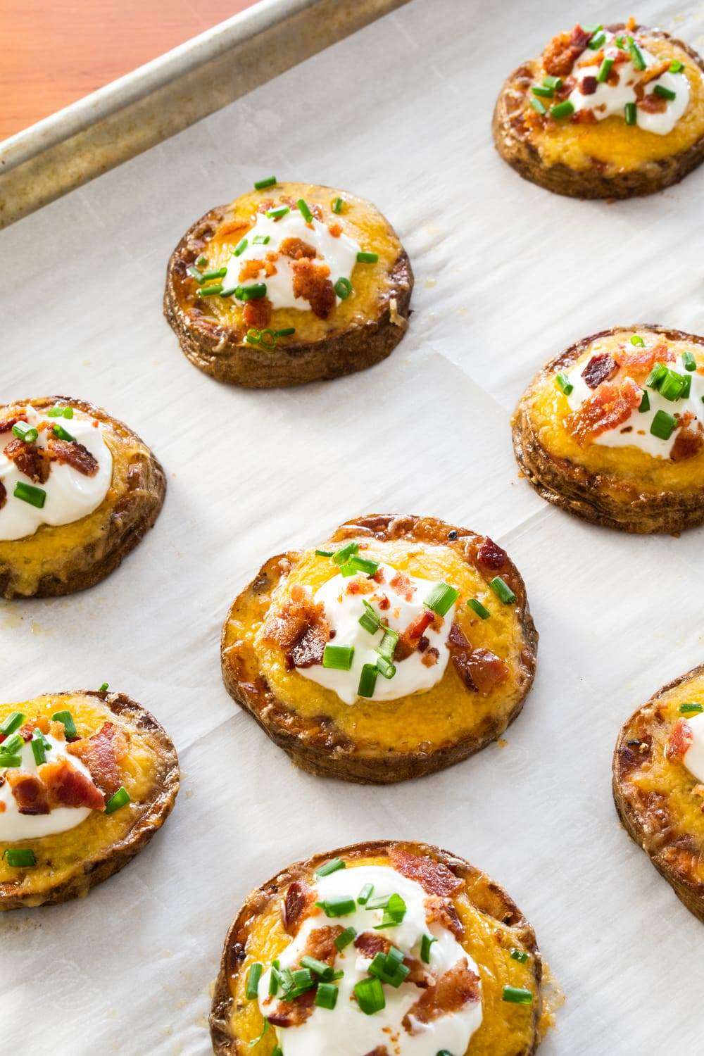 - Add a dollop of sour cream, bacon bits, and fresh chives to the top of each potato round.