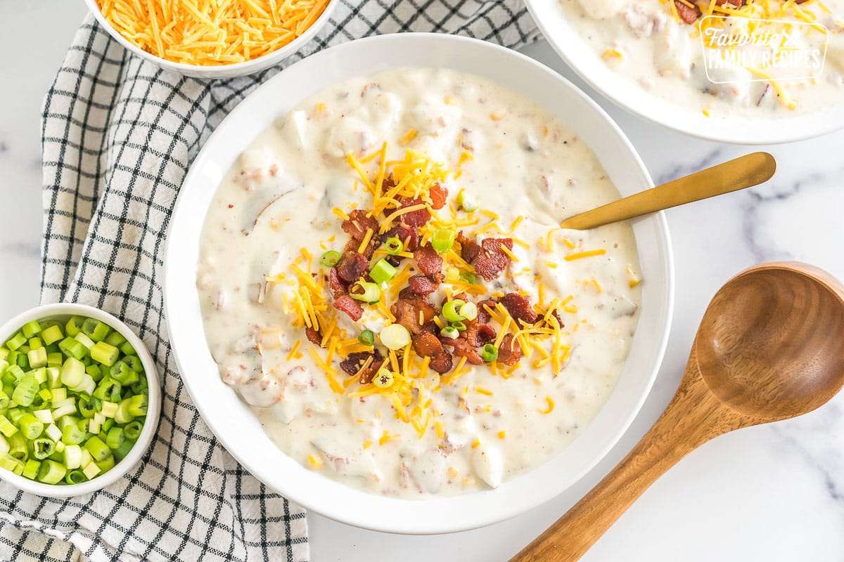 - Serve in individual bowls topped with cheddar cheese, crumbled bacon, and green onions.