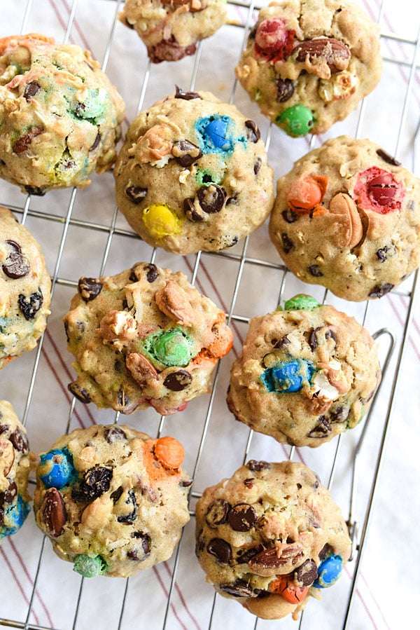 Whole wheat pastry flour, nuts, raisins, popcorn, coconut and chocolate bits all combine to make one monster of a healthier cookie.