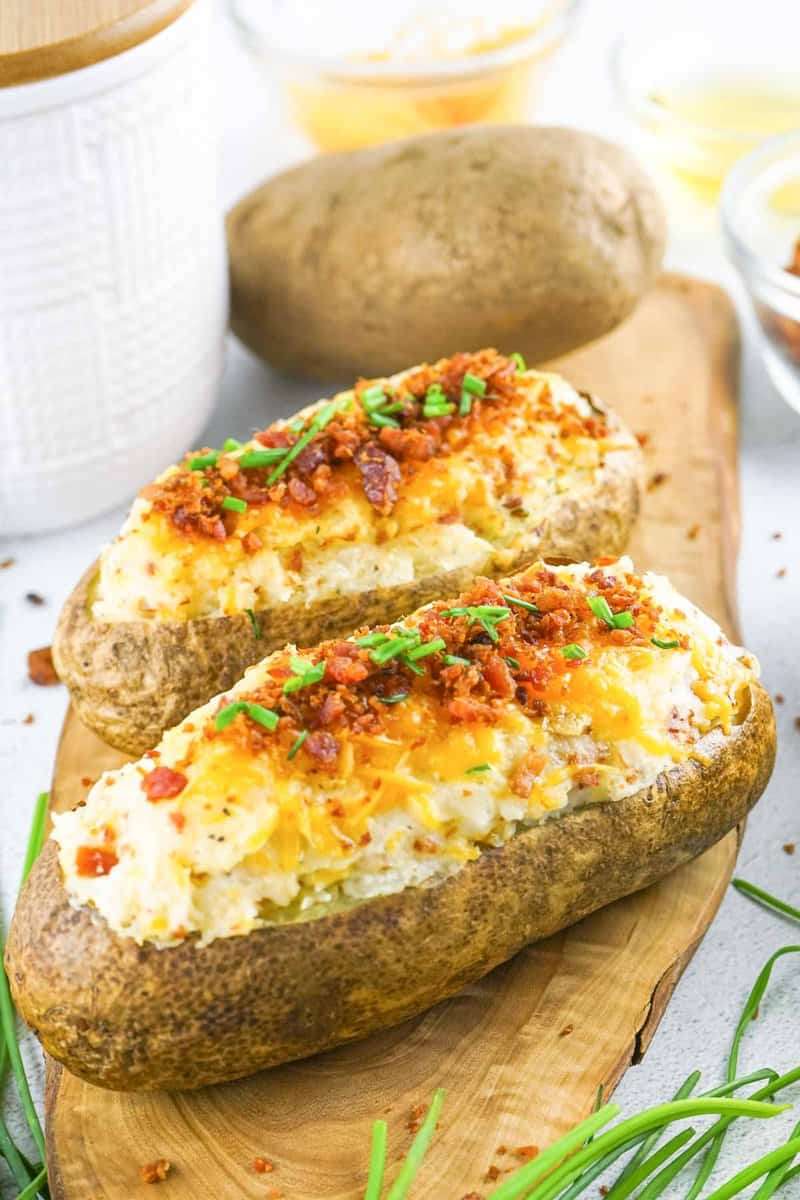 - Top the twice baked potatoes with the remaining bacon and scallions.