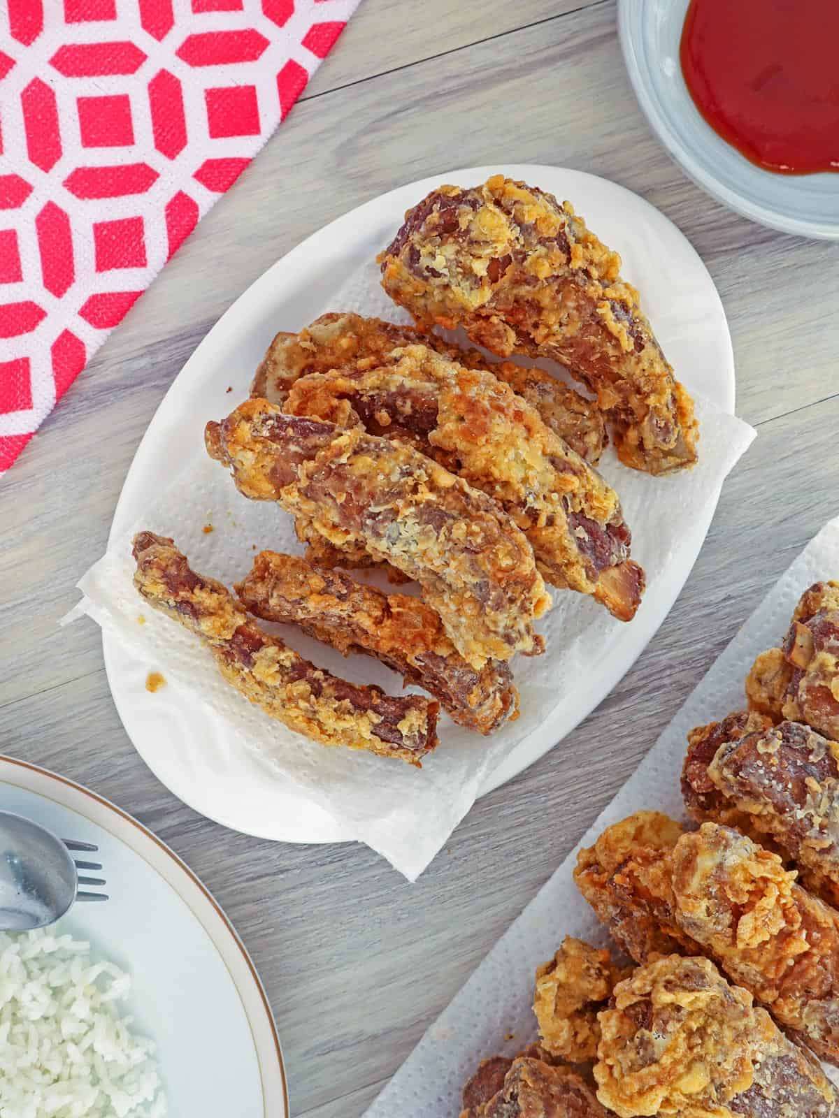 Loslos made of baby back ribs simmered in adobo marinade until tender, dredged in flour, and then deep-fried, until golden and crisp. Delicious as main dish or appetizer! Loslos are easy to make and delicious as an appetizer or main dish. Golden, crunchy, and bursting with adobo flavors, these pork ribs are sure to be a crowd-pleaser.
