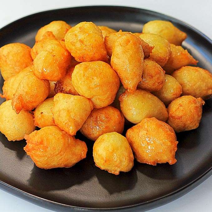 - Punch down the dough to release the air, then using a teaspoon dipped in oil, take a little dough, form into a ball, and immerse it in the deep fryer.