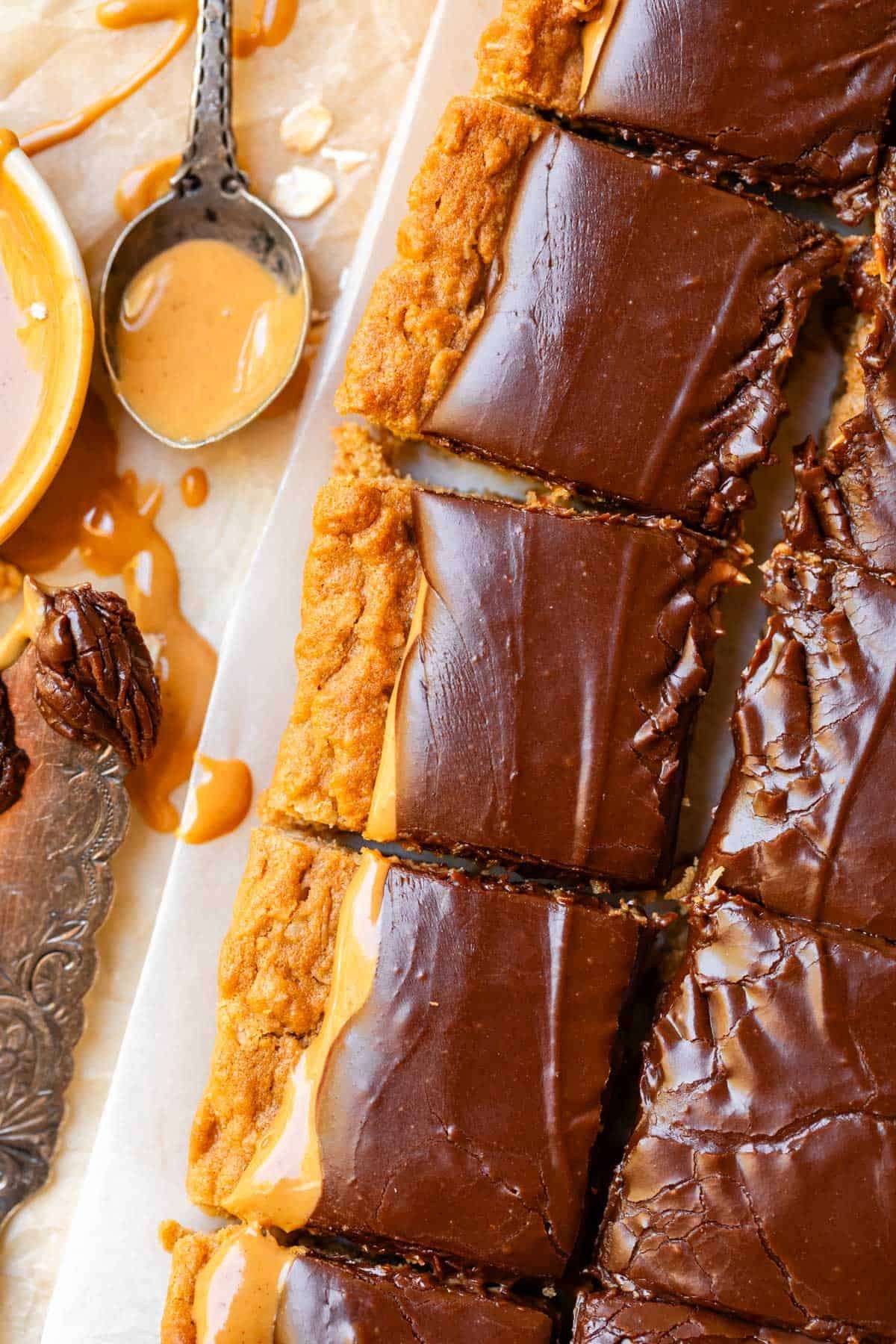 Lunch Lady Peanut Butter Bars from The Food Charlatan. They are insanely good, and come in clutch with the pb/chocolate. We start with a thick chewy peanut butter oatmeal cookie base, but then we go and top it with a layer of straight up peanut butter, PLUS a rich chocolate frosting that is like the crackly frosting top on a Texas Sheet Cake. Y'AAALLLLLL it's so good. This dessert feeds a crowd and is perfect for potlucks, reunions, summer BBQs, Father's Day, or literally any day after school!