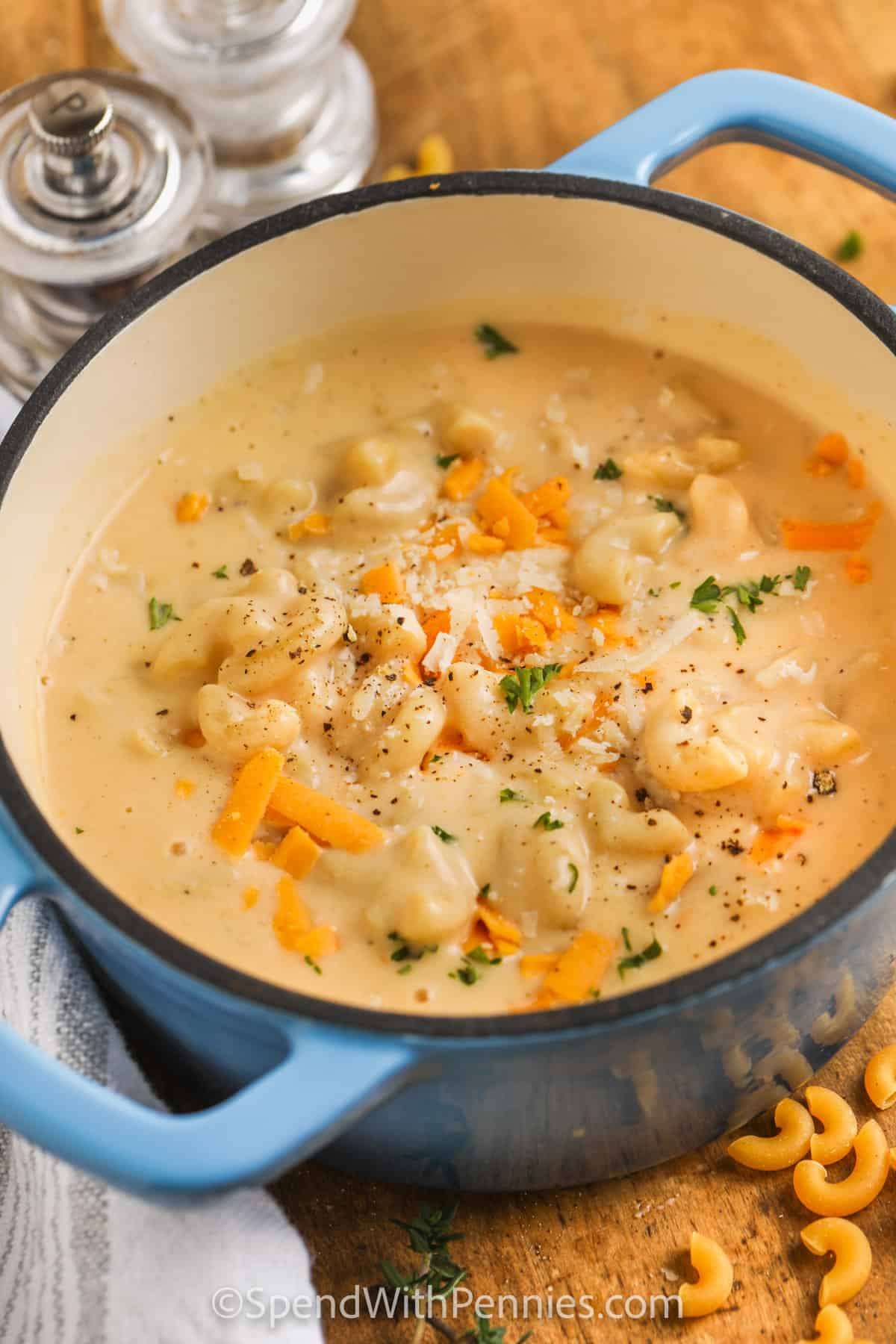 Creamy and delicious mac & cheese soup is loaded with 3 kinds of cheese.