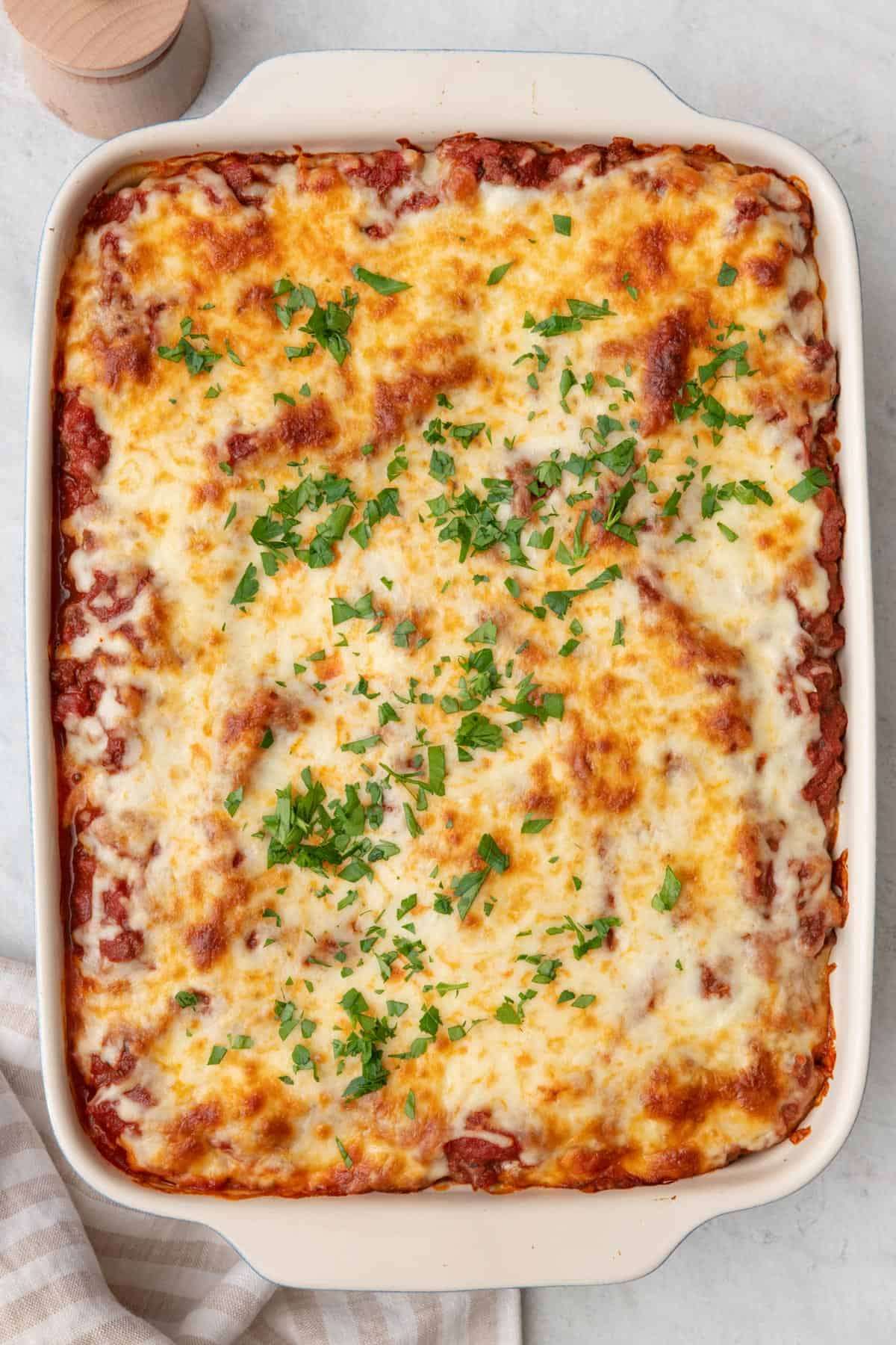 - Sprinkle the shredded mozzarella cheese on top and bake in the preheated oven until the cheese is golden and bubbly, 25-30 minutes.