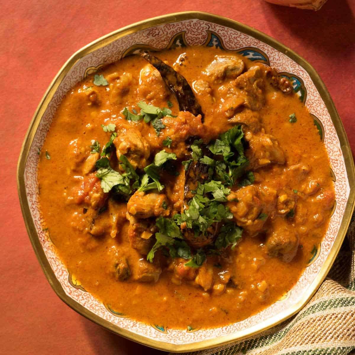 Chicken madras is an Indian curry that is red in color and with a heavy use of chili. Raita and rice are often served as accompaniments to the dish.