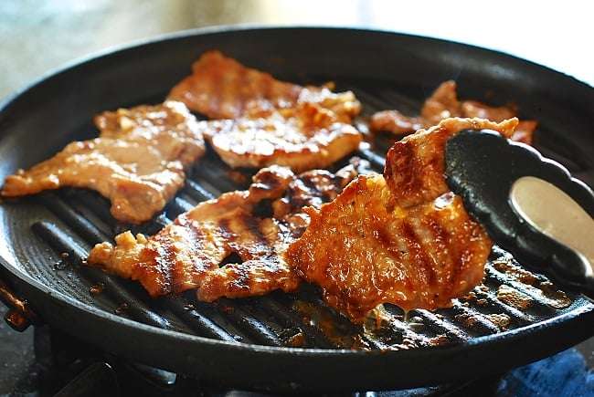 - Heat a grill pan or a skillet over medium high heat and add the pork slices. Immediately lower the heat to medium. The marinade will burn if the heat is too high. Cook until the pork is cooked through and slightly caramelized, one to two minutes each side. Turn over a couple of times to prevent the marinade from burning.