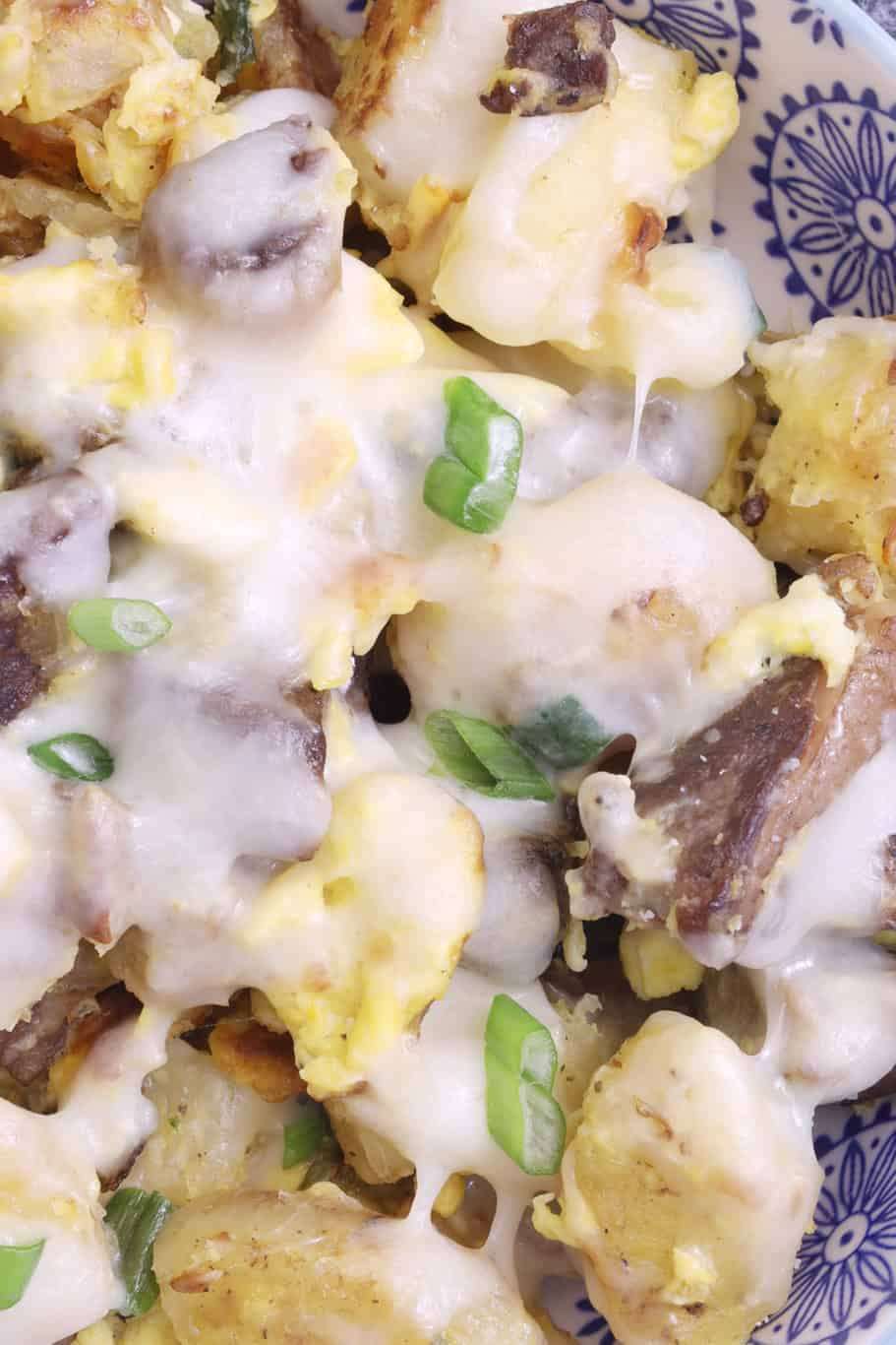 Mandi'o Chyryry So'o is a traditional Paraguayan dish made with mandioca (cassava) and leftover meat, typically asado (grilled beef).The name comes from Guarani: "Mandi'o" means cassava, "Chyryry" means fried or sautéed, and "So'o" means meat.This hearty dish repurposes boiled cassava, combining it with sautéed onions, eggs, and melted cheese for a rich, flavorful meal. Enjoy it as a hearty breakfast, a savory side, or a satisfying main course.