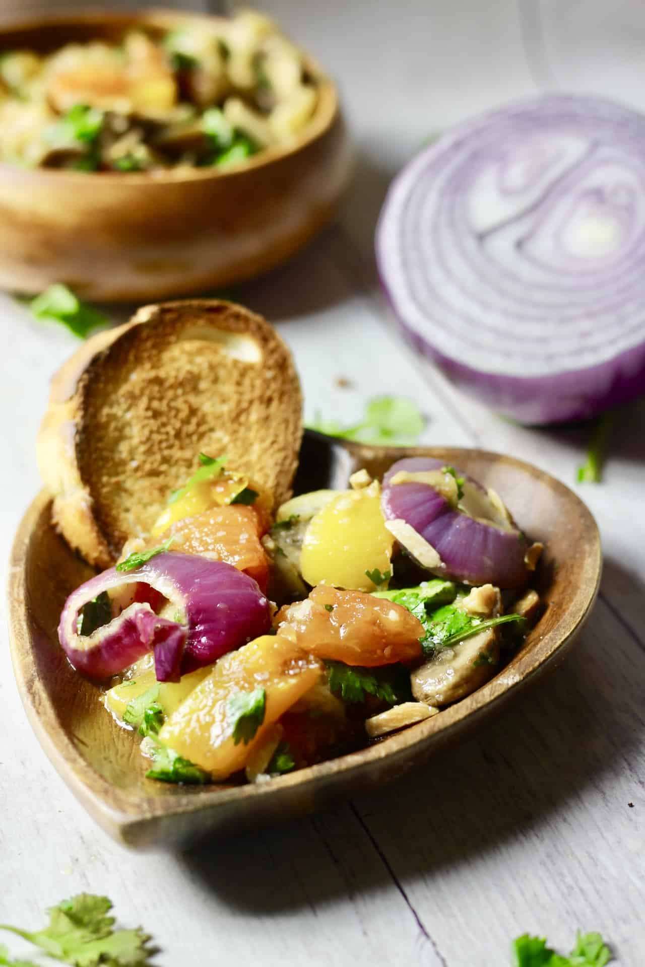 - Once vegetables are cool, remove the peels from the eggplant and the tomatoes. Chop all of the vegetables and mix together, along with mushrooms, the toasted almonds, and the cilantro.