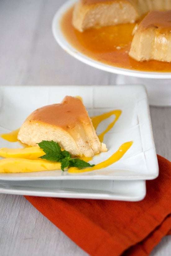 - Add 1 1/2 cups of mango puree and continue to mix for 1 to 2 minutes. Pour the mixture into a prepared bundt pan. (Mixture may be slightly lumpy. If you want a smooth flan, strain the mixture before you pour it into the bundt pan.)