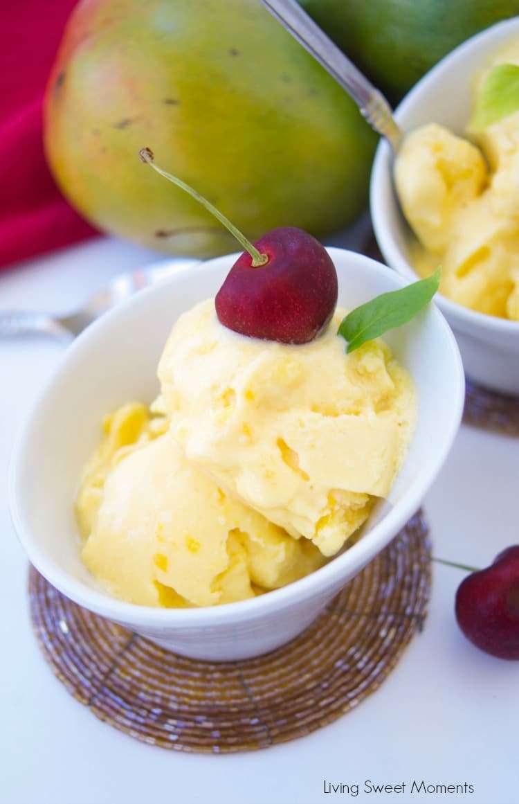 This creamy homemade mango frozen yogurt recipe only requires 3 ingredients to make and no ice cream machine needed. A perfect summer dessert for a hot day