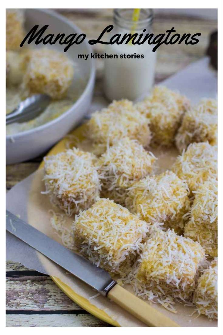 - Grab another bowl and pour in the coconut. Prepare a tray to put the finished Lamingtons on. Start dipping them into the mango puree, shake off then roll them into the coconut.