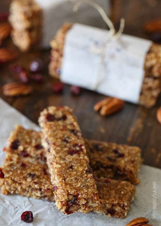 Chewy bars with chunks of toasted pecans and dried cranberries combined with toasted oats, almond butter and pure maple syrup. I'm in LOVE with these bars!