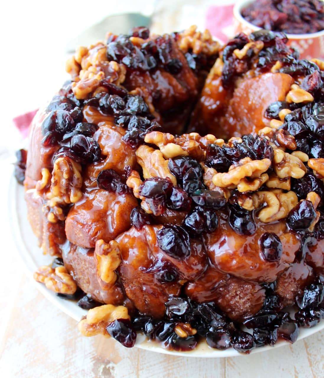 Maple syrup, dried cranberries and walnuts top this decadent monkey bread recipe that’s perfect for fall brunches and holiday breakfasts!
