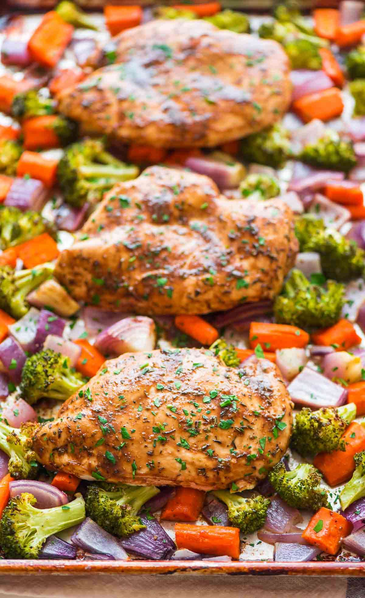 Maple dijon chicken and vegetables is a healthy sheet pan dinner that bakes on a single pan for quick clean up. An easy weeknight dinner!