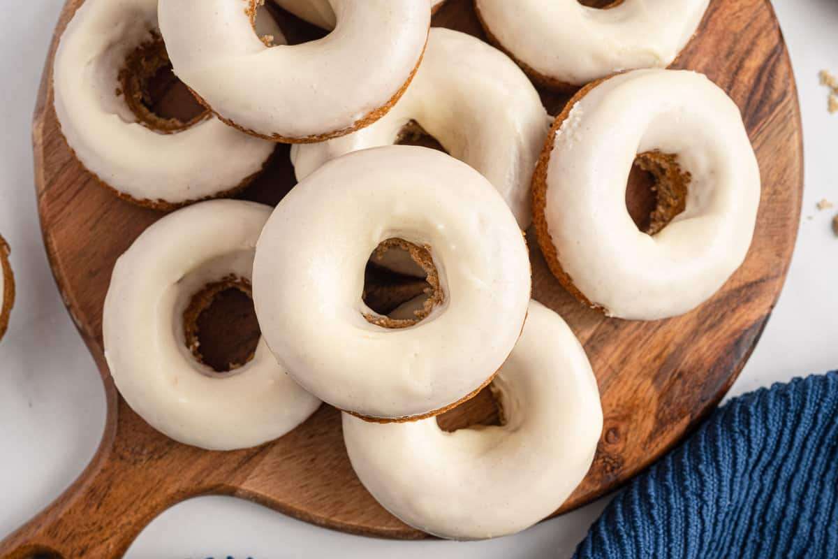 These baked donuts are spiced with cinnamon and cloves and then topped with a sweet maple glaze. These have all the cozy fall flavors we love and, because they're baked instead of fried, they're super easy to make!
