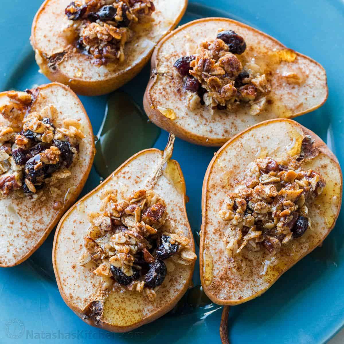 Baked Pears stuffed with buttery oats, walnuts, cranberries and cinnamon. Pears baked in the oven become meltingly tender and baking really amplifies the natural sweetness and flavor of pears. Serve baked pears for breakfast with yogurt drizzled with maple syrup, or for dessert topped with vanilla ice cream or whipped cream.