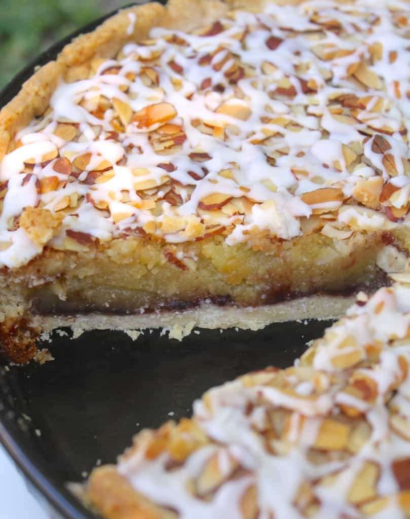 A classic British tart which has a jam base, cake like frangipane filling and almonds and icing on top. Delicious!