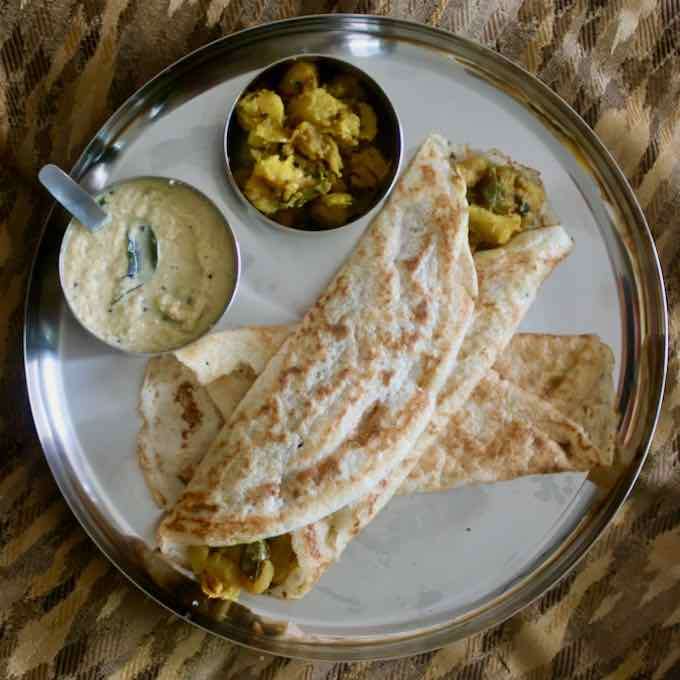 La masala dosa es una crepe de arroz y lentejas rellena de un masala de patatas, que es popular en la India.