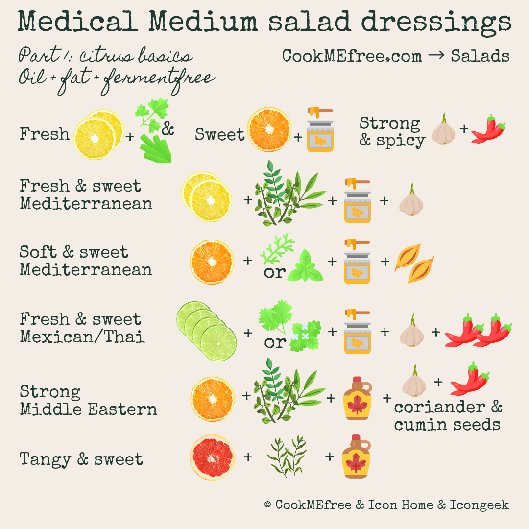 Quick and easy to make dressings based on citrus juice. Oil, fat and ferment free. With green herbs, spices, garlic or chili peppers.