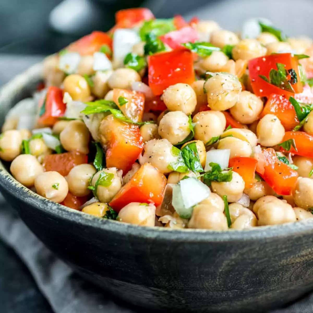 - In a large bowl toss together chickpeas, onion, bell pepper, garlic and parsley.