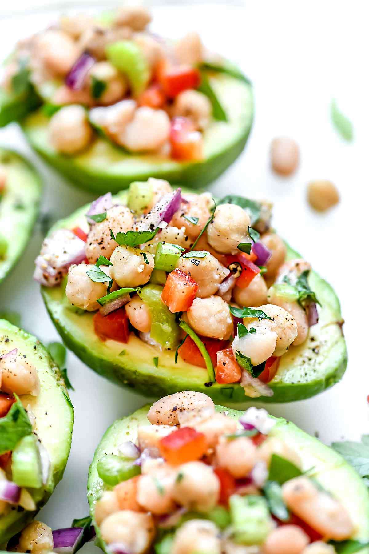 - Slice the avocados in half and discard the pit. Carefully peel the skin from the avocado. Spoon ⅓ cup chickpea salad into each half and serve more on the side if desired.