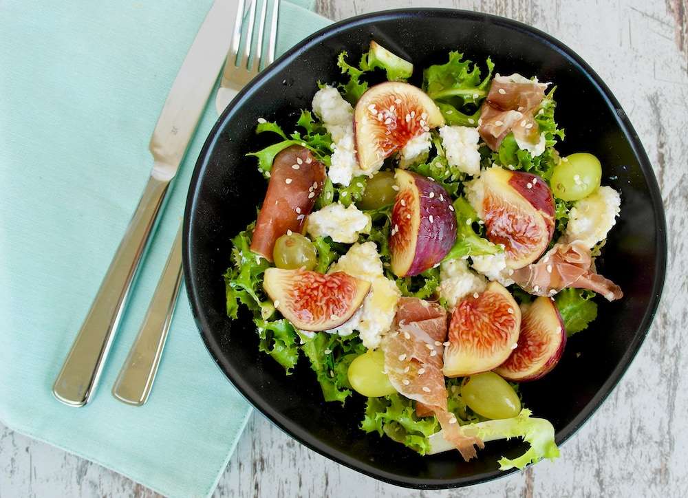 This Mediterranean fresh fig salad is the perfect combination of sweet and salty, healthy, and indulgent. Fresh figs mingle with greens, grapes, whipped ricotta, and a few slices of salty prosciutto. Full of flavor and color.