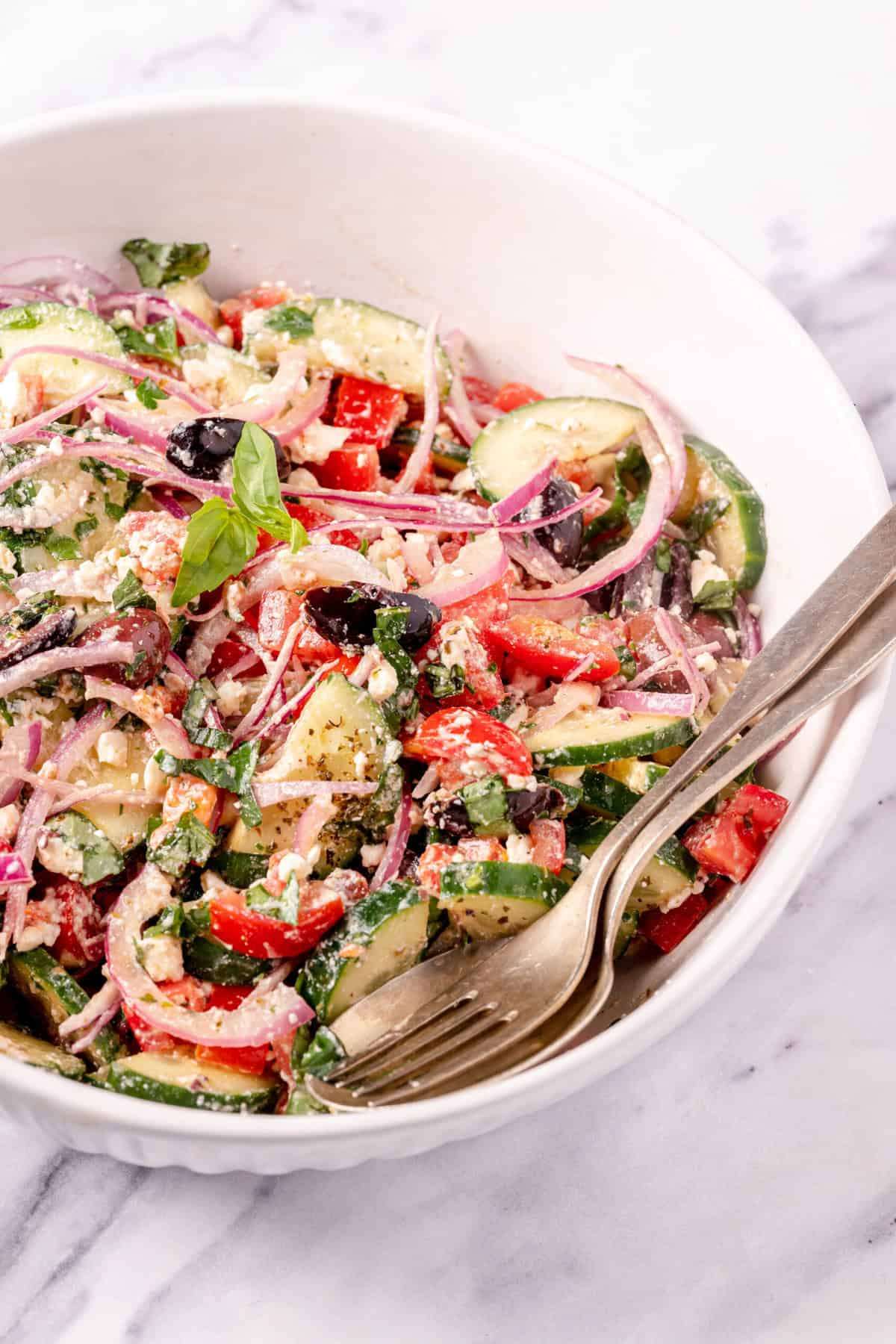 - In a large salad bowl, mix the cucumbers, tomatoes, onion, parsley, basil, and olives.