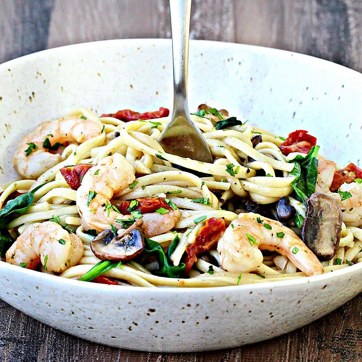 - Heat the oil in a large sauté pan over medium high heat. Add the mushrooms and cook, stirring occasionally until the start to soften. Add the garlic cook another minute until fragrant. Add the sundried tomatoes, spinach, wine, salt and pepper. Cook 2-3 minutes until spinach wilts. Add the shrimp scampi along with the sauce and toss to combine.