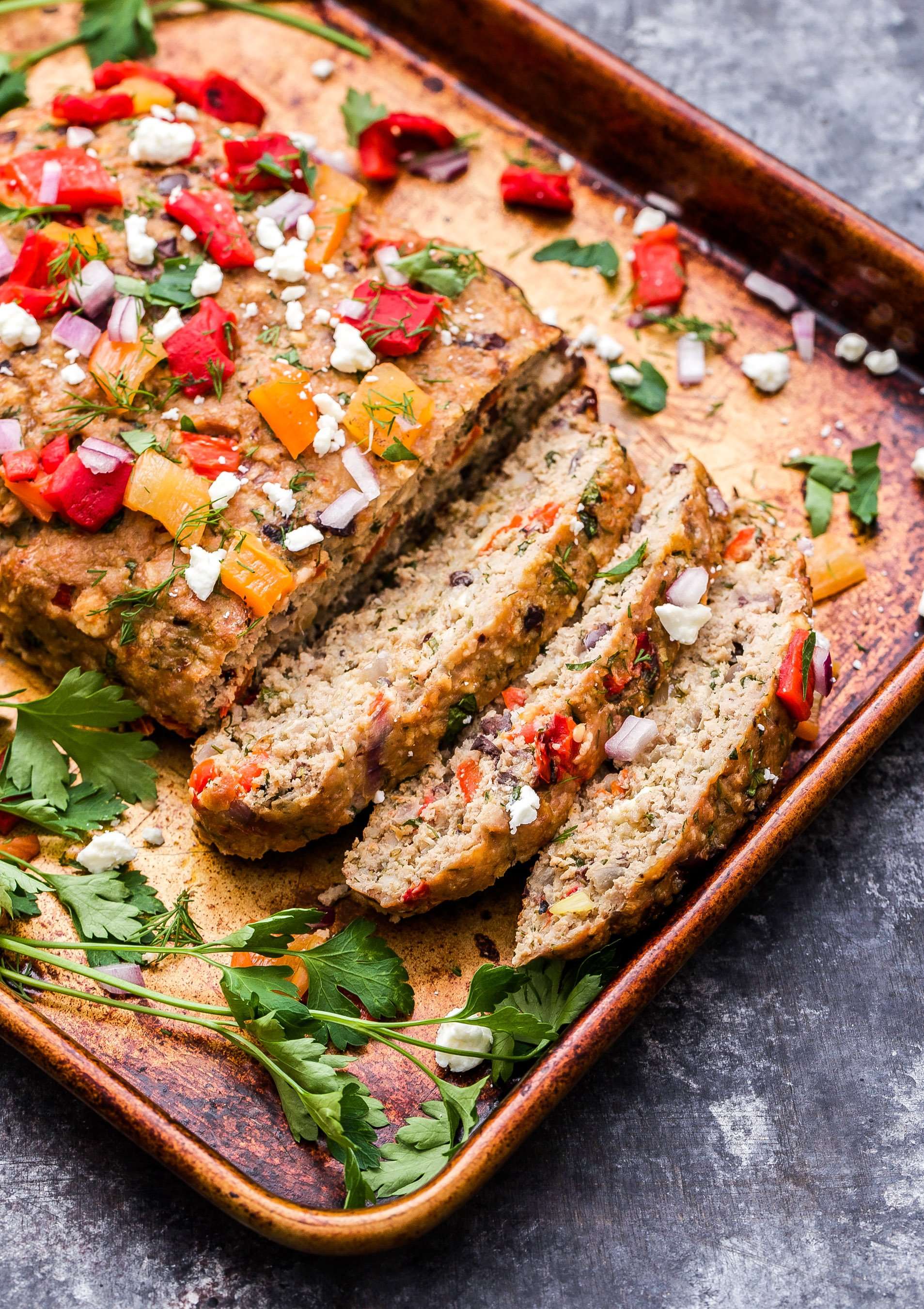 This moist and flavorful Mediterranean Turkey Meatloaf is full of roasted red peppers, garlic, feta, kalamata olives and fresh herbs.