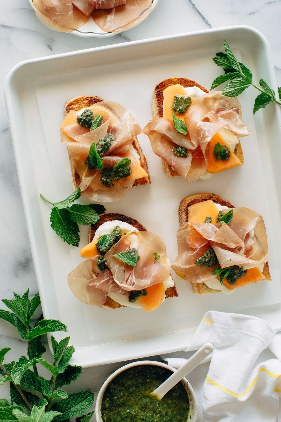 Melon and Prosciutto Toast with Mint Pesto