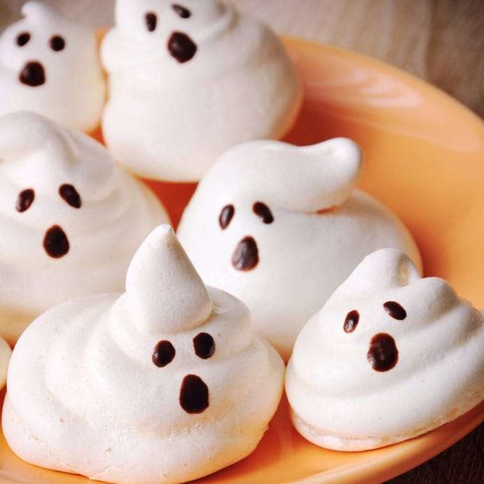 These Meringue Ghosts are so simple to make for Halloween with just 2 ingredients. Eat them alone or use them to top off a festive cupcake.