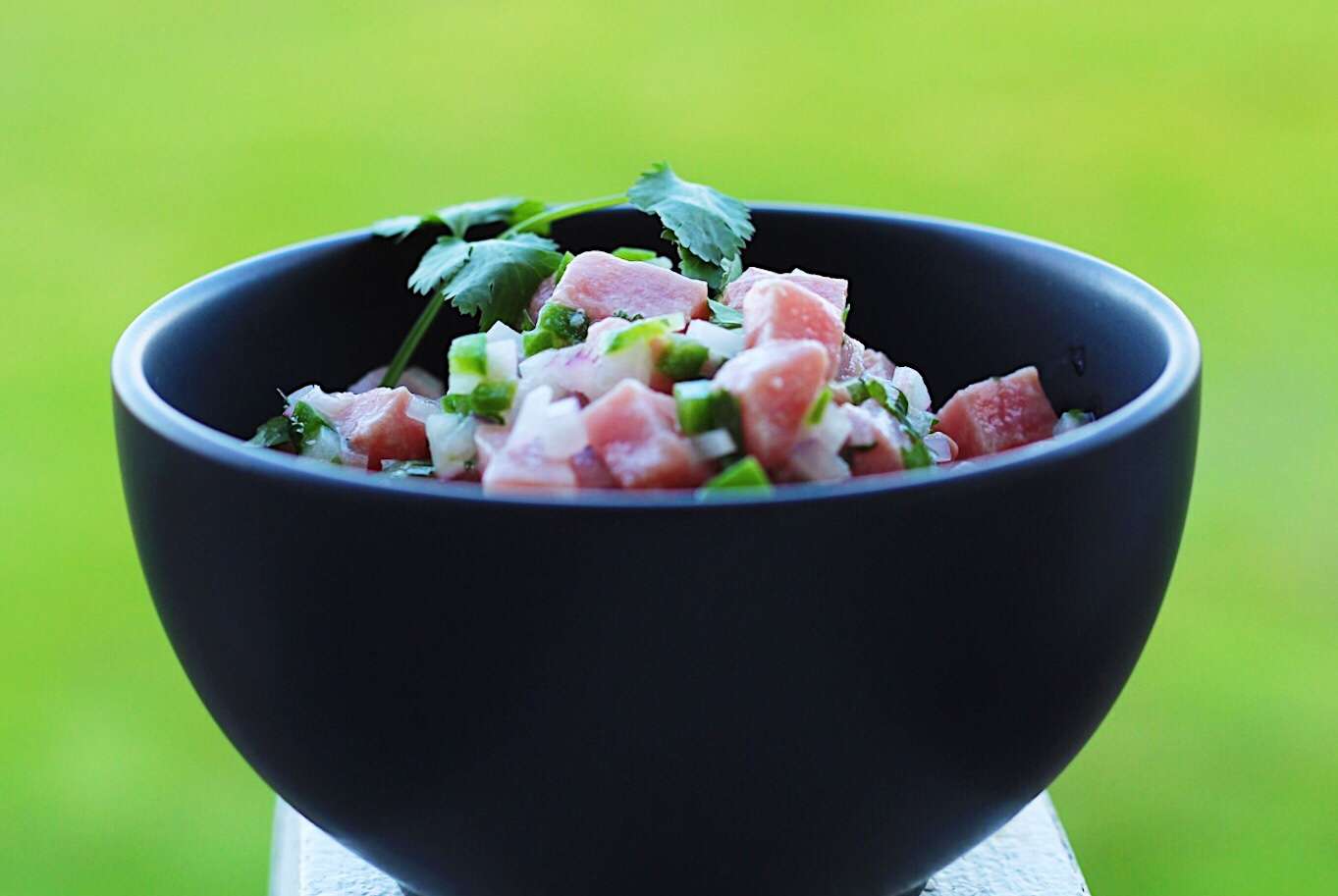 - Add cubed tuna, jalapeños and lime juice, toss gently and marinate in fridge ½ hour or up to 4 hours.