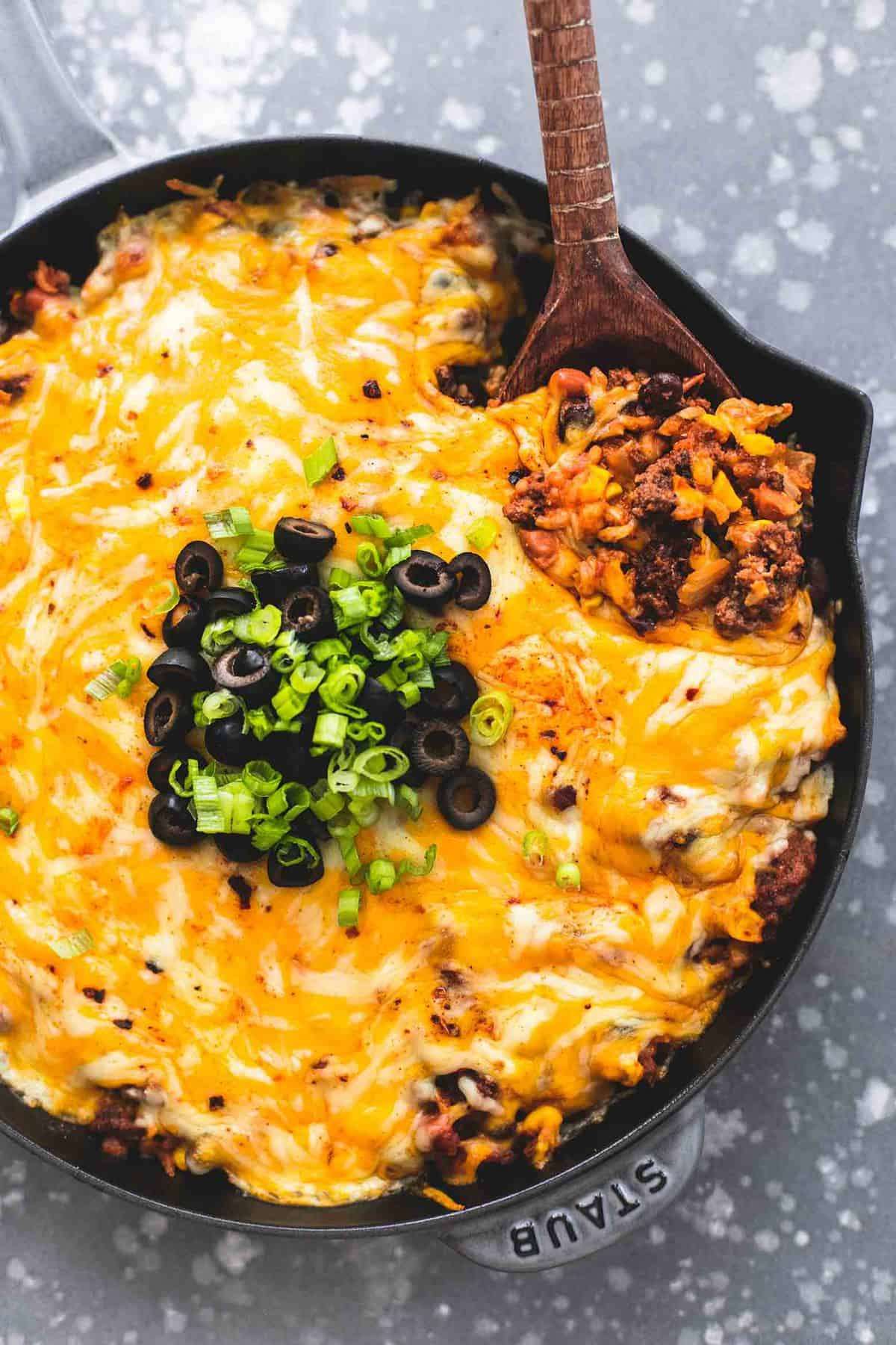 - Sprinkle cheese over the top and transfer the skillet to the oven. Bake for 10-15 minutes until cheese is completely melted. Top with any desired toppings and serve.